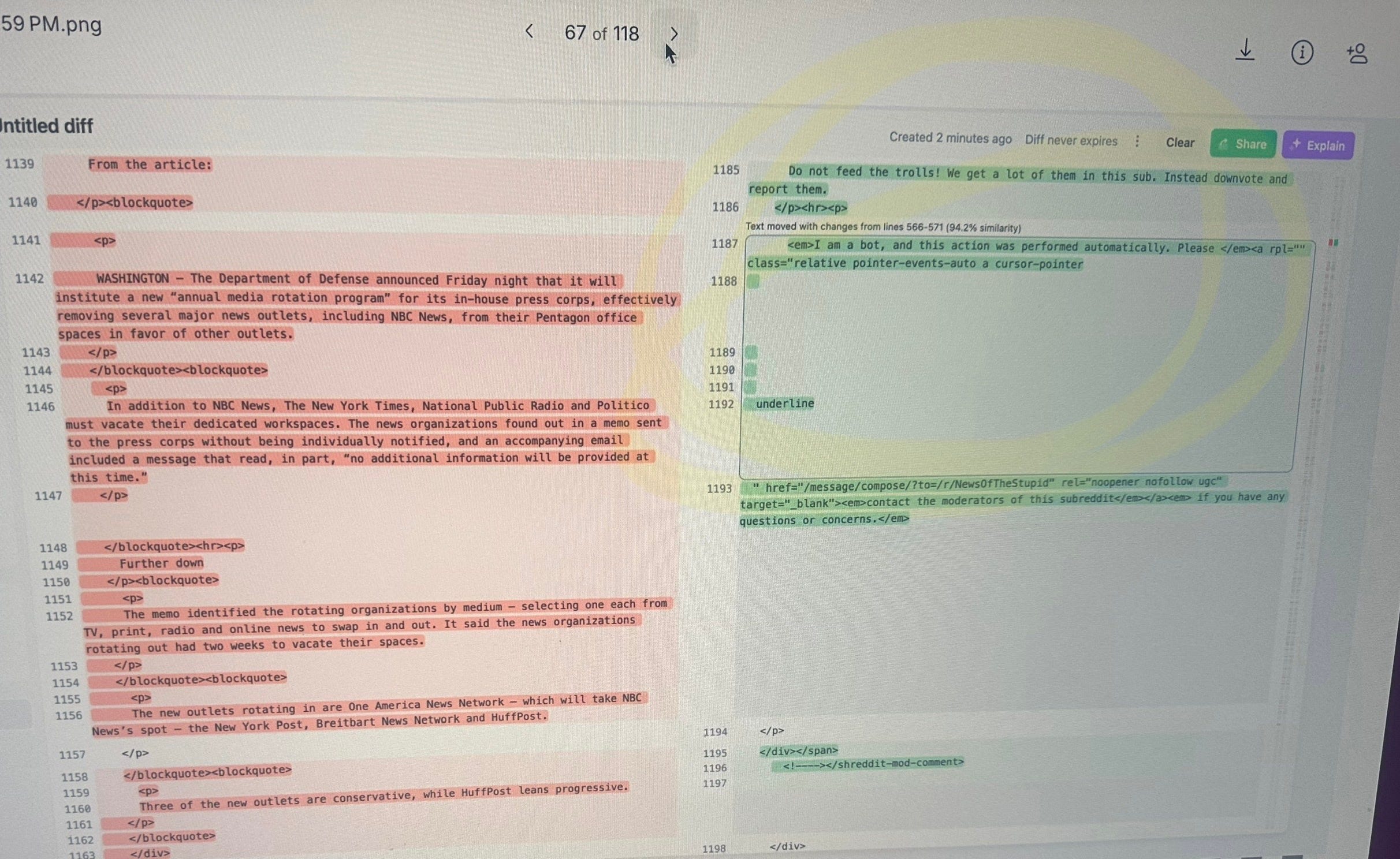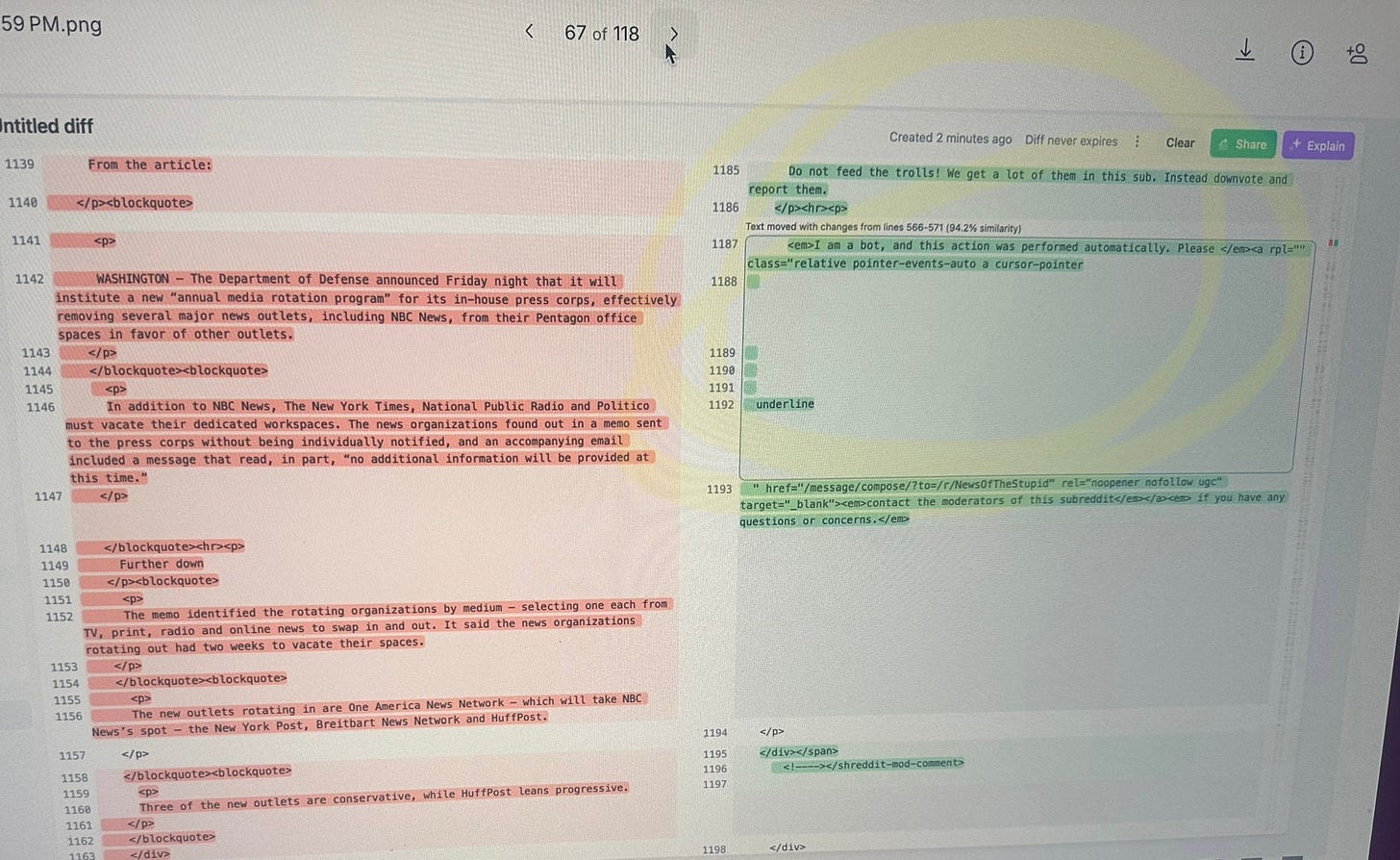 Bot suppression and manipulation of NBC News and other mainstream media comment sections when specific phrases like “mutationObserver,” “Palantir,” or “Truth Social Mixpanel” appeared.